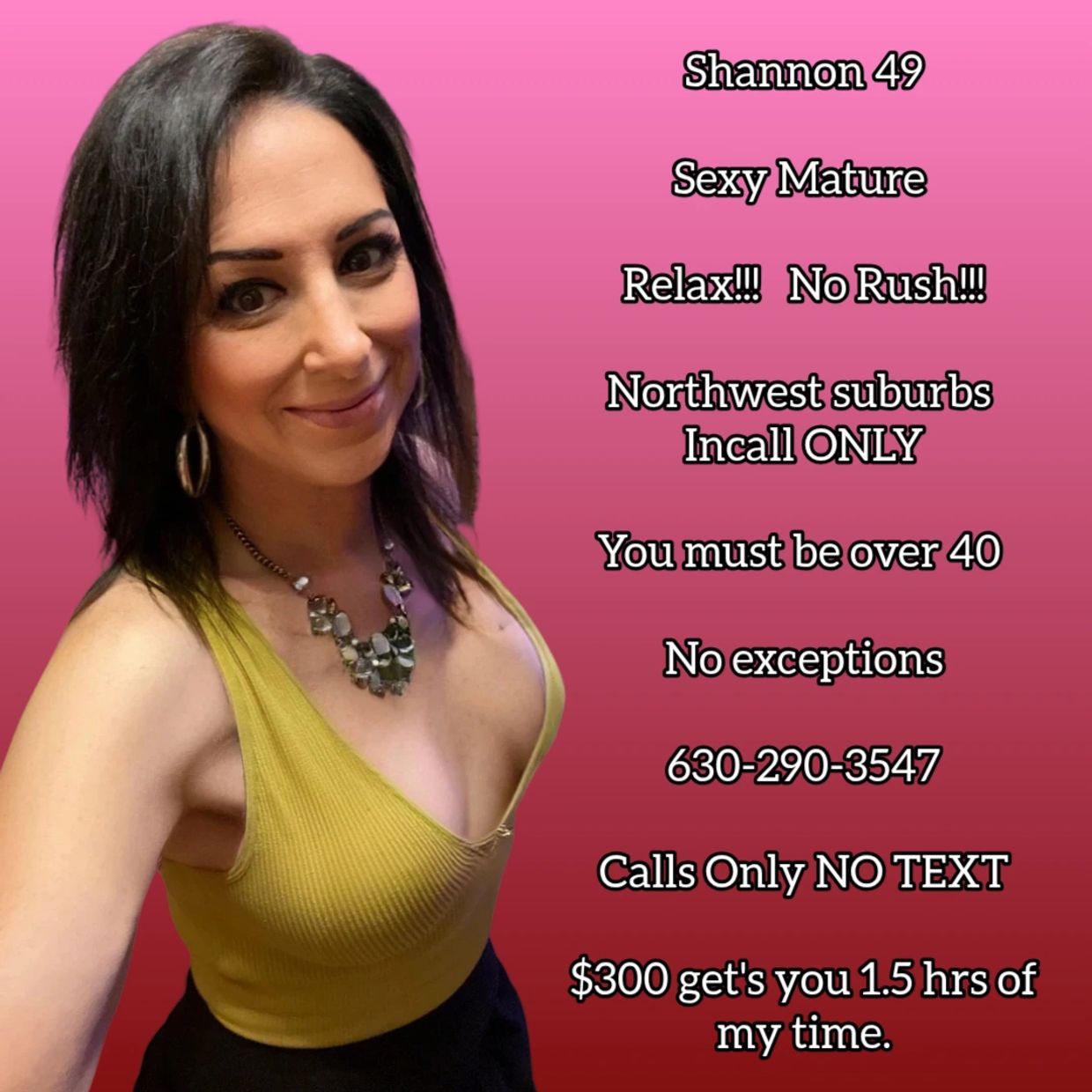 I am Shannon Independent Companion in the Northwest Suburbs of Chicago West of O'hare , Mature 5'9" 38dd 7" Bottom open minded Transgender Woman , warm , educated and inquisitive by nature ,I enjoy meeting selective nice upscale gentleman.